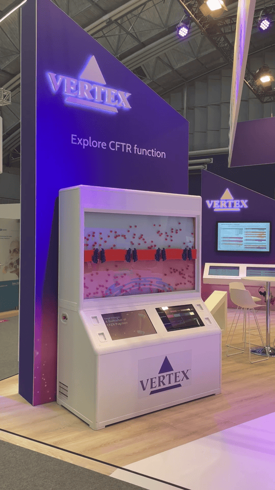The chosen concept shows a representation of a cell membrane with chloride ions represented by red foam balls. During a demonstration CFTR channels are opened allowing the chloride ions to pass through the membrane until equilibrium is achieved inside and outside of the cell pictured. As each additional channel is opened an infographic lights up indicating the changing status of the condition.